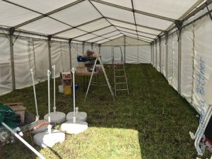 Die Theke Fiats abgebaut, die Küchengeräte weg und auch der Zeltboden im großen Zelt ist schon aufgeräumt. Hier wird noch der Zeltboden von außen entfernt…
