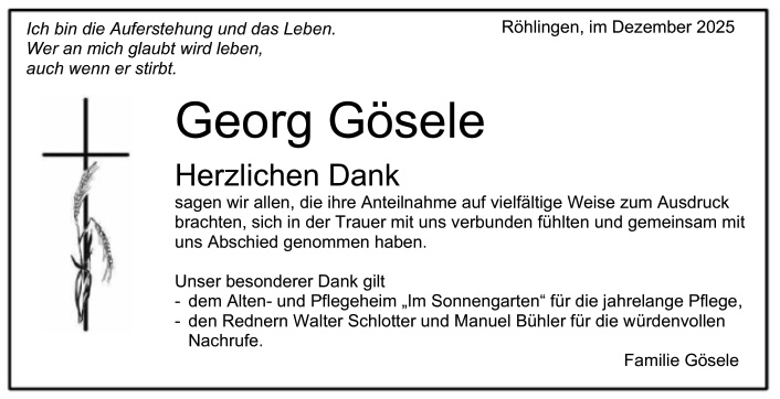 ELLWANGEN-RÖHLINGEN (db)-Am Samstag, 29. November, musste Röhlingen Abschied nehmen von Georg Gösele. Er gehörte zu den Menschen, die das kommunalpolitische Leben in Röhlingen entscheidend geprägt hatten und war am 25. November im Alter von 95 Jahren friedlich eingeschlafen. In Röhlingen auf dem Friedhof fand er seine letzte Ruhestätte.